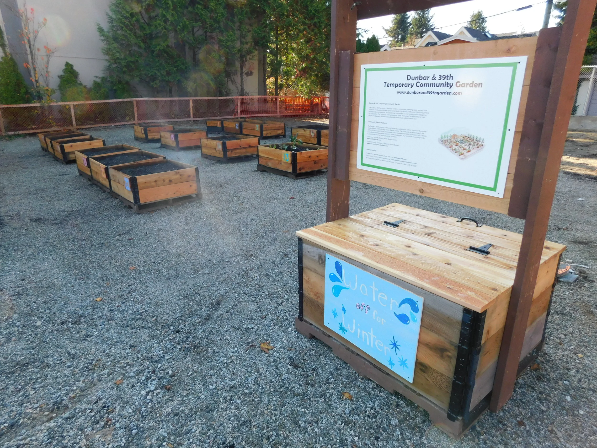 The Dunbar & 39th Temporary Community Garden was a temporary growing space in the Dunbar neighbourhood of Vancouver, BC, Canada. The garden was located at the corner of Dunbar St. and West 39th Ave. The temporary growing space was assembled in 2017 and had 100 community garden beds, in addition to seating, garden art and a community noticeboard! This allotment garden was for community members to grow food and flowers.